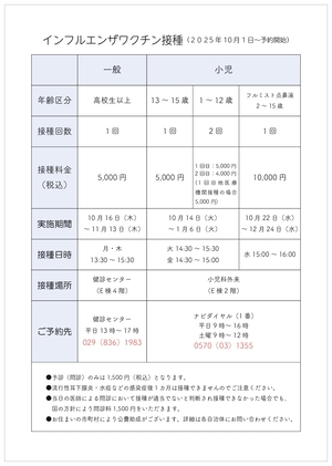 当院ではインフルエンザワクチン接種予約を10月1日(水)から受付開始します。詳細は以下の表をクリックしてご確認ください。