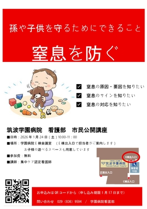 2026.01.06 イベント 市民公開講座「窒息を防ぐ」参加者募集中 当院看護部主催の市民公開講座「窒息を防ぐ」が開催されます。ふるってご参加ください。 日時:1月24日(土) 10:00~11:00場所:当院E棟大会議室 一覧へ お知らせ 2025.12.17 イベント 小児 AYA がん患者の支援を考えるシンポジウムに当院スタッ... 2025.12.01 ニュース 年末年始のお知らせ 2025.12.01 ニュース 当院の感染防止対策について 2025.11.25 ニュース 【テレビ放送のお知らせ】坂根正孝副病院長がNHK「スポーツ×...